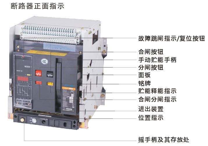 3、組成一個抽出式框架式斷路器主要有:斷路器本體,移動部分,固定部分,脫扣單元,附件組成。