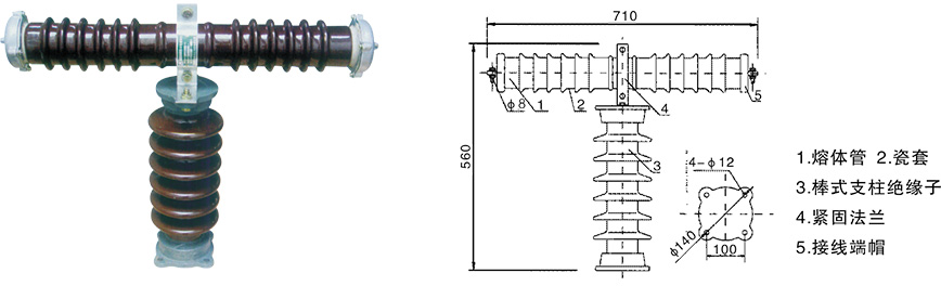 熔斷器由熔體管、瓷套、緊固法蘭、棒形支柱絕緣子和接線端帽等組成。用壓裝的方法將兩端的接線端帽為熔體管固定在瓷套內(nèi),然后用緊固法蘭把瓷套固定在棒形支柱絕緣子上,其結(jié)構(gòu)說明和外表尺寸如圖所示。